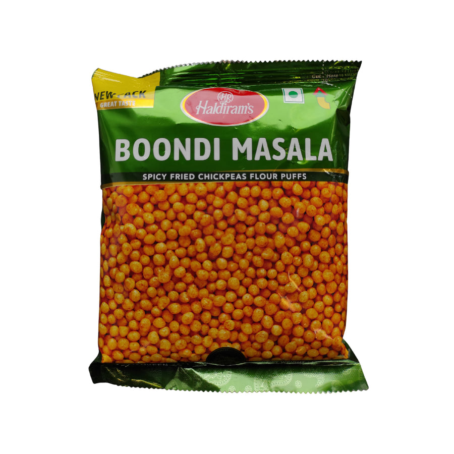 Haldiram Boondi Masala is a savory and spicy Indian snack made from chickpea flour. It consists of tiny, round, deep-fried balls (boondi) that are seasoned with a flavorful masala blend. This snack offers a delightful combination of crispy texture and bold, spicy flavors.